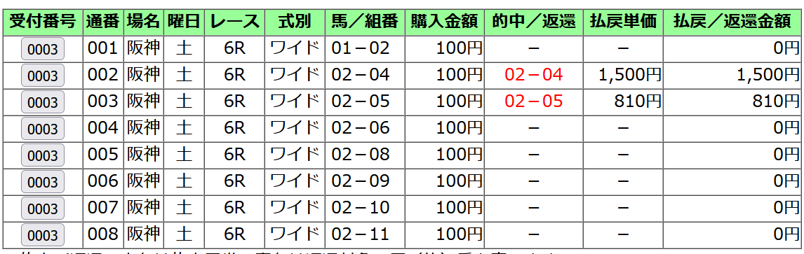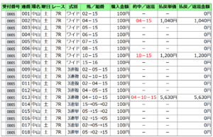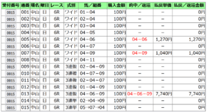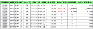 当日の総合指数1位の、フィアスプライドからデータ通りに馬連、ワイド、三連複、三連単の買い目。