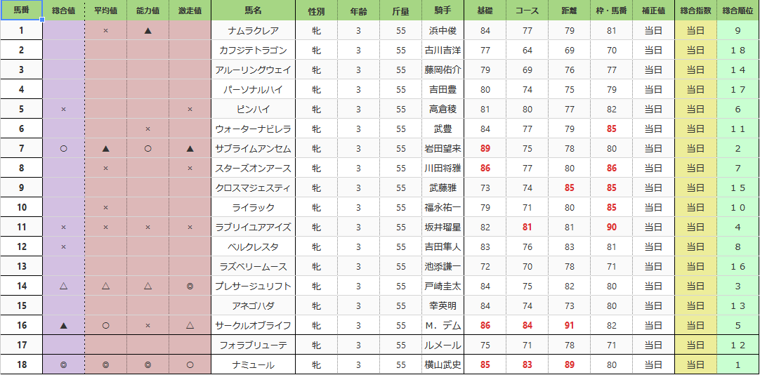 コチラの予想は、前日での指数、データベース(予想スタイル参照)を使用しており、